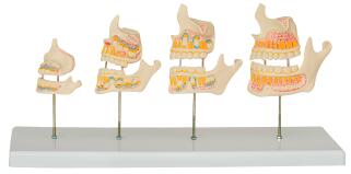 模型從乳牙至恒牙萌出的不同發(fā)育階段共4個模型(出生后不足6個月、出生后2歲左右、出生后5-7歲、出生后17-26歲)組成,每個模型由左側(cè)上、下頜骨兩個部件組成,并顯示乳牙萌出、換牙、恒牙萌出等不同發(fā)育階段以上、下頜骨和上頜竇發(fā)育過程等結(jié)構(gòu),共有出生后2歲左右10個部位、出生后5-7歲8個部位以及出生后17-26歲8個部位。顯示牙髓及血管、神經(jīng);