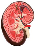 3.功能:腎作冠狀切面,顯示腎的上、下兩端、內(nèi)外兩緣及前后兩面的外形特征,腎上端薄、下端厚,外緣凸,內(nèi)緣中部凹,稱腎門,腎門是顯示腎血管、神經(jīng)、淋巴管和輸尿管出入的部位,由前向后依次為腎靜脈、腎動脈、腎盂;從上到下依次為腎動脈、腎靜脈、腎盂,在腎的剖面上,主要顯示腎的皮質(zhì)和髓質(zhì)、腎錐體、腎乳頭、腎柱、腎小盞、腎大盞、腎盂及部分腎動靜脈分支、屬支的斷段。同時,還顯示輸尿管的起始部;