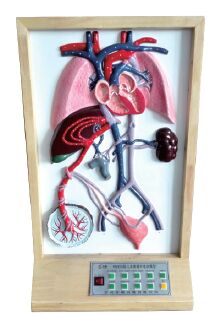 模型顯示胎兒出生前的心血管系統(tǒng)分布及其血液流通途徑,胎兒血液循環(huán)是由兩條動脈、一條靜脈組成。兩條臍動脈分別從胎兒左右兩側(cè)髂骨動脈出來,通過臍帶連接胎盤,血液在胎盤內(nèi)完成血?dú)饨粨Q后,由臍靜回到胎兒體內(nèi),之后分支成兩條,一條由肝門靜脈入肝,另一條入下腔靜脈。下腔靜脈是混合血:有來自臍靜脈含氧量較高的血液,也有來自胎兒身體下半身含氧量較低的血液;