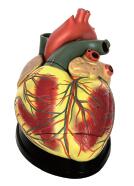 3.功能:模型外形部分,示冠狀溝,溝的上方為心底部,包括心房、心耳及出入心臟的大血管。示前、后室間溝為左右心室的分界。出人心臟的大血管有上、下腔靜脈,肺靜脈、肺動(dòng)脈、主動(dòng)脈及主動(dòng)脈弓上發(fā)出的三條血管。(由右向左為頭臂干, 右頸總動(dòng)脈、左鎖骨下動(dòng)脈),營養(yǎng)心臟的血管有左、右冠狀動(dòng)脈。示心小靜脈,心中靜脈,心大靜脈,及冠狀竇。內(nèi)部構(gòu)造:主要顯示四個(gè)心腔;此外,左右心房之間有房間隔,上有卵園窩,左右心室之間有室間隔,在隔上示膜部和肌性部;