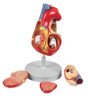 3.功能:模型外形部分,示冠狀溝,溝的上方為心底部,包括心房、心耳及出入心臟的大血管。示前、后室間溝為左右心室的分界。出人心臟的大血管有上、下腔靜脈,肺靜脈、肺動(dòng)脈、主動(dòng)脈及主動(dòng)脈弓上發(fā)出的三條血管。(由右向左為頭臂干,右頸總動(dòng)脈、左鎖骨下動(dòng)脈),營(yíng)養(yǎng)心臟的血管有左、右冠狀動(dòng)脈。示心小靜脈,心中靜脈,心大靜脈,及冠狀竇。內(nèi)部構(gòu)造:主要顯示四個(gè)心腔;此外,左右心房之間有房間隔,上有卵園窩,左右心室之間有室間隔,在隔上示膜部和肌性部;
