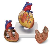 3.功能:模型外形部分,示冠狀溝,溝的上方為心底部,包括心房、心耳及出入心臟的大血管。示前、后室間溝為左右心室的分界。出人心臟的大血管有上、下腔靜脈,肺靜脈、肺動脈、主動脈及主動脈弓上發(fā)出的三條血管。(由右向左為頭臂干, 右頸總動脈、左鎖骨下動脈),營養(yǎng)心臟的血管有左、右冠狀動脈。示心小靜脈,心中靜脈,心大靜脈,及冠狀竇。內(nèi)部構(gòu)造:主要顯示四個(gè)心腔;此外,左右心房之間有房間隔,上有卵園窩,左右心室之間有室間隔,在隔上示膜部和肌性部;