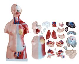 3.功能:顯示兩性人體內(nèi)臟器官的位置及頭部解剖的形態(tài)和構(gòu)造,表現(xiàn)呼吸、消化、泌尿,生殖 等主要人體解剖系統(tǒng)。頭頸右半側(cè)顯示顱骨、咬肌、顳肌等結(jié)構(gòu),眼眶內(nèi)有眼球,在頭頸部作矢狀切面,顱腔容納腦的右半球,腦的腹側(cè)面有十二對(duì)腦神經(jīng),示鼻腔、口腔、喉部示喉腔,喉室、聲門裂、甲狀腺的外側(cè)葉后面示甲狀旁腺。胸腔內(nèi)的兩肺額狀切面,顯示肺內(nèi)結(jié)構(gòu),心臟作冠狀解剖,表示左右房室的構(gòu)造異同,心臟血管有上下腔靜脈,肺動(dòng)靜脈,主動(dòng)脈,供講解大小血液循環(huán)應(yīng)用。胸蓋顯示女性乳房外形及解剖狀;